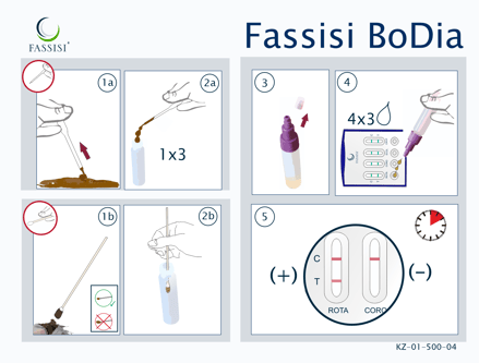 De Fassisi BoDia is een immunochromatografische sneltest die gelijktijdig de uitwerpselen van kalveren controleert op vier diarreeverwekkers, zodat vooral gemengde infecties gemakkelijk