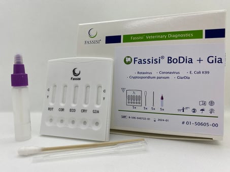 De Fassisi BoDia+Gia sneltest dekt de ziekteverwekkers rotavirus, coronavirus, E. coli K99, C. parvum en Giardia duodenalis.